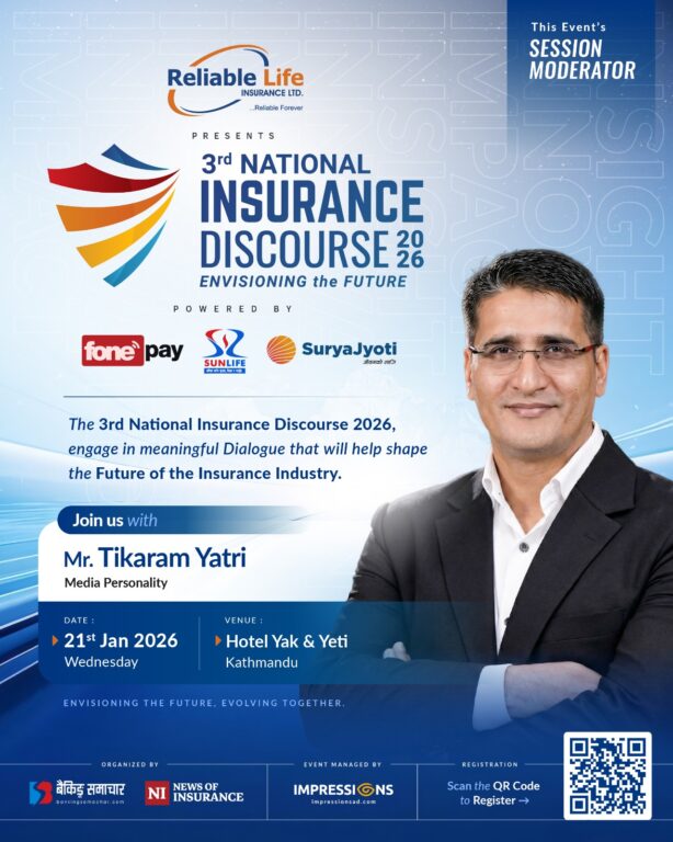 The Insurance Discourse will be held on Magh 7, 2082, at Hotel Yak & Yeti, Kathmandu. The event will bring together representatives from regulatory bodies, insurance companies, banks and financial institutions, insurance experts, and other distinguished stakeholders. Key discussion topics will include bancassurance policy and market realities, access to healthcare and the future of health insurance in Nepal, insurtech innovation and integrating insurance into everyday lifestyles, and the roadmap for restructuring and transforming the insurance industry for modern living.