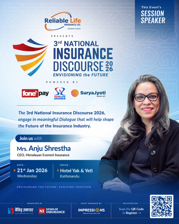 The Third Insurance Discourse, with Reliable Nepal Life as the Title Sponsor, will be held on Magh 7 at Hotel Yak & Yeti, Kathmandu. The event is powered by Fonepay, Sun Nepal Life, and SuryaJyoti Life. Representatives from regulatory bodies, insurance companies, banks and financial institutions, insurance experts, and other distinguished stakeholders are expected to attend.